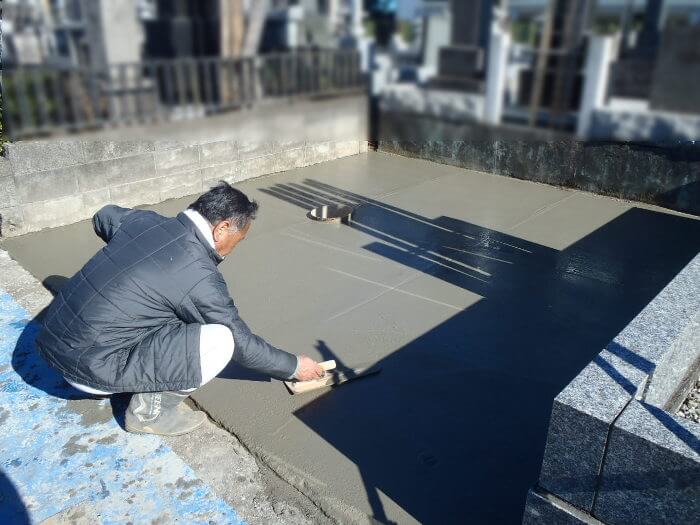 コンクリートを流し込んだら、表面をきれいにならしていきます。職人が丁寧に仕上げています。このあと、10日ほどしっかりと養生して基礎工事が完了です。