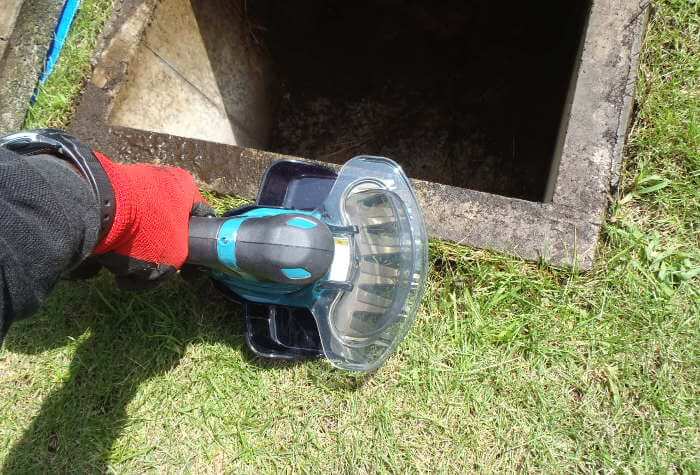 入り口周辺の芝をきれいに刈って、蓋に芝をかみ込まないようにします。せっかくきれいに掃除をした納骨室に、芝が隙間から入り込むことがないように気を配ります。