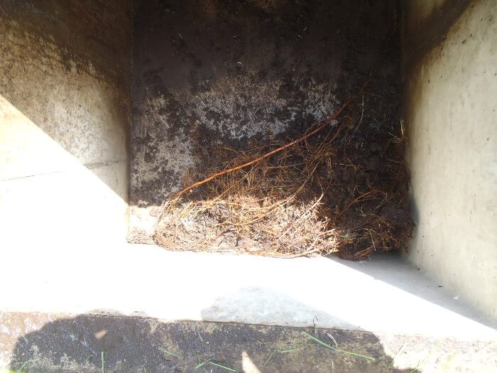 こちらの霊園には既設のコンクリートの納骨室と蓋石があります。蓋石を取り外すと、納骨室内はこのような状態でした。水抜き穴から芝生の根が入り込んで、泥なども一緒に入り込んでいます。納骨室を開けて中を確認することはあまりありませんから、長い年月の間に少しずつ入り込んで溜まってしまっているのです。すでに納められているお骨壺を一旦取り出して、これをきれいにしていきます!