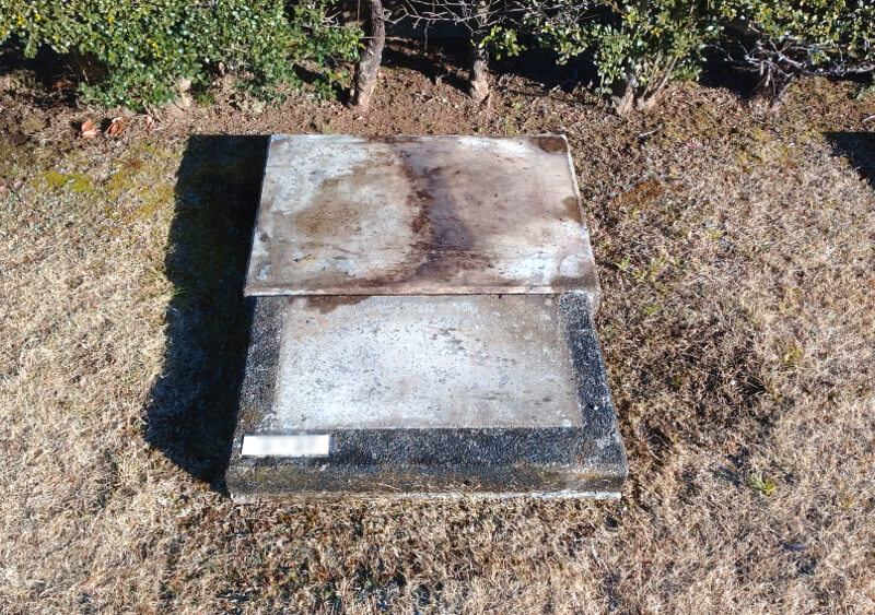 思い出の里霊園の芝生墓地は、このような縦長のコンクリートカロートが既設されています。その上に蓋石が前後2枚あり、奥の蓋石の上に墓石本体を設置する形になっています。納骨する際や取り出しの際は、手前の香炉や拝石などを一旦取り除き、手前側のコンクリートの蓋石を取り外して行います。お墓じまいの際は、このカロートの中も清掃してきれいにして、次に使われる方に気持ちよく使っていただけるようにして返還します。